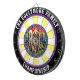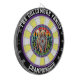 Arte circular de un poderoso oso pardo en un bosque, enmarcado con un overlay objetivo
