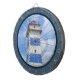 Diseño de temática náutica con decoración de faro acuático en un marco azul oscuro. Es posible cambiar el color de fondo y añadir uno diferente al diseño con su elección.