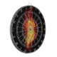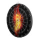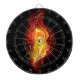 Una brillante pluma de pavo real hecha de fuego y llama sobre fondo negro.