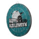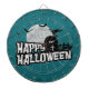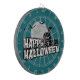 Feliz ilustracion de diseño de texto de Halloween con decoración de cementerios y murciélagos en luna llena sobre fondo azul grunge