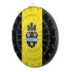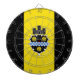 Dartboard with flag of city of Pittsburgh, Pennsylvania; flag with three vertical bands of black and yellow with illustration of castle and shield in the center