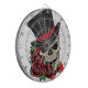 El cráneo de caballero está vestido con su sombrero más alto y corbata de arco rojo con hermosas rosas rojas.