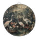 pintura botánica vintage de grúas paradas en un lago rodeado de hermosas flores exóticas con un palacio al fondo