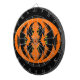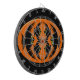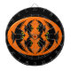 Este impresionante diseño de dardos presenta un óvalo naranja con seis cuervos. Cada cuervo tiene ojos amarillos con pupilas negras y alas estiradas. Los cuervos están volando unos hacia otros formando una forma oval. El fondo es negro.