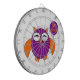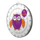 Este impresionante dart board presenta un lindo búho con los ojos cerrados como si estuviera durmiendo y unas garras bonitas. Su cuerpo es morado y sus alas, orejas, garras y pico son naranjas. El búho sostiene un globo con "Halloween feliz" escrito en él y está listo para el fiesta.