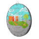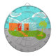 Este moderno Personalizado House Dart Board de Mid Century le hará sentirse como en casa. El diseño artístico minimalista de los años 60 se compone de una elegante casa de piedra naranja y de cristal acuático sobre un frondoso césped verde en forma de boomerang. El césped forma un oasis en medio de su entorno gris y de hormigón. Una palmera verde se balancea en la brisa. Cuatro escalones de piedras naranjas conducen a la puerta trasera, roja y retro, con tres cristaleras rectangulares. A la izquierda de la puerta, una maceta de flores turquesa acoge una planta tropical verde. La casa tiene un techo blanco inclinado en forma de V que apunta hacia dos nubes blancas con forma de riñón. El cielo es una sombra positiva de agua. ¡Nadie querrá tirar piedras de esta moderna casa de cristal! ¡Compra este producto kitschy de la edad espacial y sé el gato más genial de tu bloque!