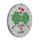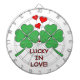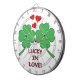 Afortunado en el amor. Dibujos de tréboles de cuatro hojas con formas cardíacas flotando sobre ellos.