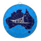 Una simple silueta blanca de un trineo de perro y la Cruz del Sur superpusieron en un mapa azul de Australia. Puede elegir un color de fondo diferente. ¿Quién lo hubiera pensado? Mushing boca abajo en Oz. El trineo de perros es bastante popular en Australia. En el Monte Hotham en Victoria hay una gran carrera cada año.