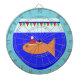 Este impresionante dart board incluye un divertido naranja Navidades de peces de colores usando un sombrero festivo de santa. El pez dorado está nadando en el agua azul de su pecera. El pez ha decorado la parte superior del tazón con banderas rojas y verdes que deletrean el mensaje "Merry Fishmas". Este divertido pescado de temporada está listo para un gran fiesta de Navidades.