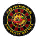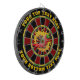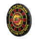Diseño de tablero rojo oscuro, negro, verde y amarillo. Cada color es personalizable. Pimienta caliente en círculo de llamas. Dos áreas de texto personalizado en el anillo exterior.