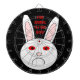 Este impresionante tablero presenta la cara triste de un conejo blanco. Este conejo tiene un gran fruncido en la cara porque es un conejo de laboratorio que ha tenido cosméticos probados. Los blancos de sus ojos son rojos e hinchados. El diseño ha sido creado para llamar la atención sobre el sufrimiento innecesario causado por los ensayos de cosméticos en animales. El atrevido texto rojo dice "¡Detengan los experimentos con animales ahora!"