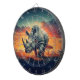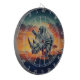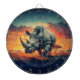 Un rinoceronte majestuoso se alza frente a una puesta de sol vibrante, con formas geométricas intrincadas. La sabana africana se extiende detrás, salpicada de acacias.
