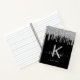 Un fondo negro de moda con detalles modernos de purpurina de plata falsa, pinturas con aspecto de goteo. Personalice y agregue un nombre, su letra de monograma y un título. El nombre está escrito con un gran guión de estilo moderno y con letras a mano con toques. Para que los cambios sólo eliminen el nombre del ejemplo, deje los espacios o la emoji delante y después del nombre. Texto en blanco y gris. Utilícelo como diario, diario, para tomar notas, para la escuela, el trabajo o la oficina en casa.