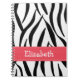 Esta cubierta de encargo linda y elegante del cuaderno espiral de la piel del estampado de zebra y de la cebra con las rayas blancos y negros y un contraste rosado cosieron diseño de la cinta se pueden personalizar con su nombre. Este espiral - el cuaderno encuadernado se puede utilizar como diario también, y es igualmente grande para los materiales de oficina caseros o de nuevo a uso de la escuela. Diseño y © Chrissy H. Studios, LLC de las ilustraciones. Todos los derechos reservados.