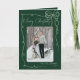 Esta tarjeta de Navidad plegable presenta una foto vertical en la portada, enmarcada por un borde de garabatos estilo cinta que gira en espiral. Un lazo coqueto dibujado a mano se encuentra en la esquina superior derecha, con "Feliz Navidad" en letra manuscrita en la parte superior izquierda. La parte inferior derecha incluye espacio para el apellido de su familia o nombres individuales y el año. El fondo es verde esmeralda profundo con arte de garabatos y fuentes en verde salvia para un aspecto festivo.