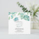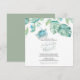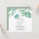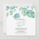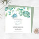 Esta invitación para la cena de ensayo en forma de cuadrado presenta sus nombres en una tipografía de escritura a mano elegante con los detalles del evento en una fuente serif clásica de color gris carbón sobre un fondo blanco crujiente con un borde superior de mi tortuga marina original pintada a la acuarela y hojas de palma monstera de follaje tropical en tonos de azul, verde y turquesa. La tarjeta de invitación se revierte a un color verde salvia tropical complementario. Una elección botánica y elegante para bodas de surf playeras casuales y cenas de ensayo costeras. Para ver mi suite completa de papelería de boda visite DoTellABelle en Zazzle.