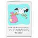 Dibujo animado del bebé de la cigüeña que lleva divertida. Conveniente como tarjeta de la enhorabuena para las nuevos mamáes y papás.