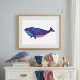 Un ilustracion de ballena brillante y divertido en morado y azul.