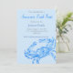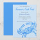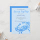 Elegante invitación al estilo de la playa para una fiesta de cangrejo de verano. Incluye un ilustracion vintage de un cangrejo azul con los detalles de tu fiesta en diferentes tonos azules y grises. El titular aparece en fuentes caligráficas . Tarjeta de estilo costero con reverso azul sólido. Diseño de Alma Wad .