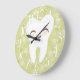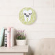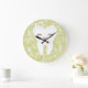 Este reloj de la diversión ofrece un diente adorable, sonriendo en un fondo verde de dientes, de estrellas y de remolinos -- los números pueden ser quitados fácilmente -- ¡haga clic el PERSONALIZAR para añadir su propio texto o logotipo!