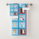 Estas toallas tienen diferentes brotes para diferentes cuadros de gente de nieve, arte de Kristie Hubler, tiene 12 parches de cuadrados, cada uno con un "folk" de nieve diferente, hombre de nieve, mujer de nieve, niño de nieve, hombres de nieve o configuraciones familiares de nieve, con arte de palabra / slogan / texto para estimular la conversación