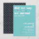 Porque cuando se pospone una boda, es importante hacer saber a sus seres queridos que todavía les gustaría que se unieran a ustedes, ¡solo que en una fecha diferente! Todavía es su boda y sigue siendo formal, así que envíe una hermosa tarjeta. Esta tarjeta de tipografía minimalista sobre fondo de turquesa aguamarina resalta sus detalles con tipos de letra frescos y modernos. Estas tarjetas diseñadas profesionalmente son rápidamente personalizables. Agregue su texto personalizado a este diseño utilizando los cuadros "Editar esta plantilla de diseño" en el lado derecho del artículo, o haga clic en el botón azul "Personalizar" para organizar el texto, cambiar las fuentes y los colores y también agregar información adicional o imágenes a este diseño. Haga clic en "Personalizar más" para abrir las opciones de edición completas. Si necesita artículos de coordinación (tarjetas de agradecimiento, etc.), por favor contácteme para un pedido personalizado. ****Para solicitudes personalizadas en las que necesita mi ayuda, no coloque este artículo en su carrito. En su lugar, envíeme un correo electrónico con su solicitud a lauralise@iyhtvdesigns.com Se le enviará un enlace a su mercancía por correo electrónico una vez que el artículo esté disponible. Puede