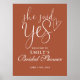 Este elegante guión de terracota "Ella dijo que sí" el signo de bienvenida a la ducha de novia puede ser personalizado con tu nombre y fecha especial. Diseñado por Thisisnotme©
