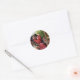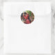 En este ilustracion vintage, una dama de rojo se dobla hacia atrás y tiene los brazos alrededor del cuello de un caballero y lo está jalando hacia un beso apasionado. Parece que están en un entorno ajardinado o quizás en un café al aire libre en el campo. "Dilo con un beso" son las palabras que aparecen en la parte delantera de este pegatina y pueden ser cambiadas o retiradas como usted desee.