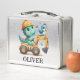 Esta caja de almuerzo personalizada cuenta con un encantador dinosaurio que conduce alegremente un vehículo de construcción en miniatura con su expresión lúdica y colores vibrantes.