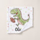 Esta toalla personalizada presenta un bonito y caprichoso dinosaurio que luce un fútbol con corazones pequeños en el fondo. Es perfecto para los amantes del fútbol. Personalizar con el nombre de su bebé por un toque único.