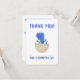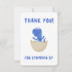 tarjeta de agradecimiento de la ducha de bebé es un lindo dinosaurio personalizado naciendo de un huevo con texto personalizado en ambos lados.