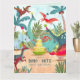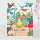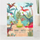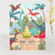 Una bonita tarjeta de cumpleaños de dinosaurios pintada a mano con dinosaurios en una jungla prehistórica. Obra de arte original de Caroline Bonne Müller.