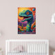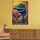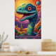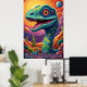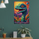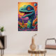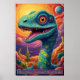 Dinosaurio caprichoso y vibrante que parece ser una mezcla de fantasía y encanto prehistórico. El dinosaurio tiene un cuello largo y una cabeza grande, con una expresión de ojos amplios con ojos cautivadores y sobredimensionados que le dan un aspecto lindo y curioso. Su piel está adornada con patrones intrincados que se asemejan a formas y puntos coloridos y giratorios, casi como si su cuerpo estuviera pintado con un caleidoscopio de texturas en azul, verde, amarillo y violeta. El vibrante fondo, con sus cielos giratorios y planetas abstractos, da la impresión de un paisaje de otro mundo, sugiriendo que el dinosaurio reside en un mundo surrealista y fantástico. Los colores brillantes y exagerados y las características lúdicas le dan a la criatura un carácter agradable y animado, ideal para un entorno mágico o de ensueño. Este dinosaurio podría pertenecer a una especie imaginada de un reino cósmico, donde la flora y la fauna prosperan en ecosistemas vibrantes y psicodélicos, mezclando la vida prehistórica con un giro de la era espacial. Su comportamiento exude inocencia y asombro, como si estuviera explorando su fantástico universo por primera vez.