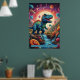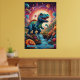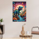 Dinosaurio caprichoso y vibrante que parece ser una mezcla de fantasía y encanto prehistórico. El dinosaurio tiene un cuello largo y una cabeza grande, con una expresión de ojos amplios con ojos cautivadores y sobredimensionados que le dan un aspecto lindo y curioso. Su piel está adornada con patrones intrincados que se asemejan a formas y puntos coloridos y giratorios, casi como si su cuerpo estuviera pintado con un caleidoscopio de texturas en azul, verde, amarillo y violeta. El vibrante fondo, con sus cielos giratorios y planetas abstractos, da la impresión de un paisaje de otro mundo, sugiriendo que el dinosaurio reside en un mundo surrealista y fantástico. Los colores brillantes y exagerados y las características lúdicas le dan a la criatura un carácter agradable y animado, ideal para un entorno mágico o de ensueño. Este dinosaurio podría pertenecer a una especie imaginada de un reino cósmico, donde la flora y la fauna prosperan en ecosistemas vibrantes y psicodélicos, mezclando la vida prehistórica con un giro de la era espacial. Su comportamiento exude inocencia y asombro, como si estuviera explorando su fantástico universo por primera vez.