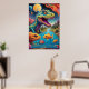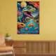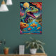 Dinosaurio caprichoso y vibrante que parece ser una mezcla de fantasía y encanto prehistórico. El dinosaurio tiene un cuello largo y una cabeza grande, con una expresión de ojos amplios con ojos cautivadores y sobredimensionados que le dan un aspecto lindo y curioso. Su piel está adornada con patrones intrincados que se asemejan a formas y puntos coloridos y giratorios, casi como si su cuerpo estuviera pintado con un caleidoscopio de texturas en azul, verde, amarillo y violeta. El vibrante fondo, con sus cielos giratorios y planetas abstractos, da la impresión de un paisaje de otro mundo, sugiriendo que el dinosaurio reside en un mundo surrealista y fantástico. Los colores brillantes y exagerados y las características lúdicas le dan a la criatura un carácter agradable y animado, ideal para un entorno mágico o de ensueño. Este dinosaurio podría pertenecer a una especie imaginada de un reino cósmico, donde la flora y la fauna prosperan en ecosistemas vibrantes y psicodélicos, mezclando la vida prehistórica con un giro de la era espacial. Su comportamiento exude inocencia y asombro, como si estuviera explorando su fantástico universo por primera vez.