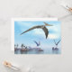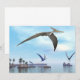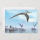 Tres dinosaurios pteranodinos volando sobre el paisaje con colinas, palmeras y agua en un cielo nublado de atardecer