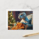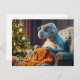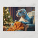 Dinosaurio sentado en un sillón vintage tejiendo con un texto de "Saludos de temporada" en un árbol de Navidad
