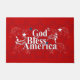 Dios Bendiga América adorna esta alfombra de puerta patriótica con estrellas blancas sobre un fondo rojo brillante.