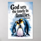 Un ilustracion acuarela de una familia de pingüinos apiñados juntos. El fondo contiene la frase "Dios establece la solidez en las familias" en una fuente vintage.