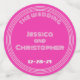 Bolas de disco de tres tamaños para tu discoteca o boda de los años 70. El frente es una bola de disco plateada. La parte trasera está personalizada en fuentes disco. El tamaño grande incluye sus nombres y la fecha del boda. El pequeño tamaño tiene un monograma. Esta versión está en groovy morado. Puede cambiar fácilmente el color de fondo en la herramienta de diseño. Nota: esta es una imagen silenciosa, no un Relieve metalizado real.