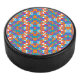 Circular decorative object with a vibrant, symmetrical pattern featuring orange, blue, and white geometric shapes, set against a dark frame and textured side.