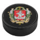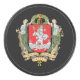 Pato de hockey con diseño con escudo de armas de Vilna, capital de Lituania; con ilustracion de san Cristóbal y niño Jesús