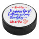 Por primera vez, papá, este texto de 'Feliz Día del Primer Padre, papá' e imagen del corazón en azul con un monograma del nombre del bebé en rojo, de un bebé. Mejor Papi. Disco de hockey.
