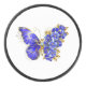 Joyería, azul, zafiro, mariposa floral brillante con ala decorada con flores azules y preciosas con hojas de oro sobre fondo blanco.