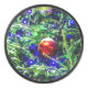 Árbol de Navidad verde, luces decorativas azules y una bola de adorno rojo cubierta de nieve fresca. Humor alegre y alegre. Feliz Navidad y Feliz Año Nuevo. Impresiones y regalos para cualquiera por diversión y buen humor. Productos y souvenirs de tipo redondo.