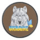 Una hermosa manera para los amantes de los animales de mostrar su apoyo a Ucrania. El diseño de un disco de hockey incluye ilustracion de lobo gris de color agua con texto "Ucrania" y mariposa con los colores azul y amarillo de su bandera nacional sobre fondo marrón.