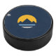 Hockey Puck con la nueva bandera de la ciudad de Reno, Nevada; una bandera azul oscura con un sol amarillo y montañas azules en el centro