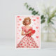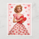 Envía un poco de romance a la antigua usanza con esta encantadora tarjeta postal vintage de San Valentín con una chica pin-up. Con una ilustración clásica inspirada en la década de 1950 de una mujer glamorosa con un vestido rosa con corazones, sosteniendo suavemente un corazón de San Valentín con lunares, este diseño captura la feminidad atemporal y el amor nostálgico.