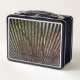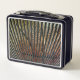 Esta lonchera tiene una foto de un baloncesto y un diseño a rayas.