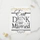diseño de invitación para Come, bebe y cásate con confeti dorado y letras personalizadas